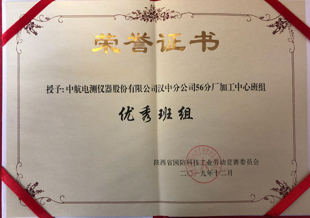 2019年12月19日,在陜西省國(guó)防工會(huì)班組建設(shè)推進(jìn)會(huì)上,漢中分公司56分廠加工中心班組被陜西省國(guó)防科技工業(yè)勞動(dòng)競(jìng)賽委員會(huì)授予“優(yōu)秀班組”榮譽(yù)稱號(hào)。