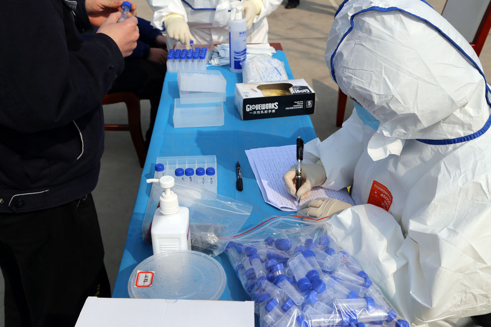 上午11點,中航電測西安中心園區(qū)第二批入園員工在綜合管理部的組織下,陸續(xù)來到南區(qū)廣場,所有員工均佩戴防護口罩,按照已定順序分散站隊,依次領取標記順序的細胞保存液,由醫(yī)務人員依次采集“咽拭子”細胞標本。醫(yī)務人員再將采集好的“咽拭子”細胞標本統(tǒng)一運送至實驗室進行檢測,統(tǒng)一出檢測結果。